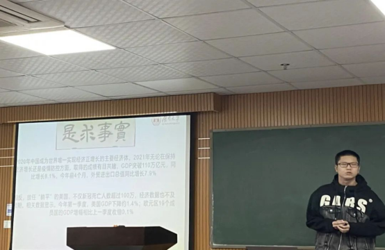 第一组由陈豪同志进行分享,该小组讨论主题是疫情防控。由全球疫情背景展开,用中国和其他国家防疫数据及政策来突出疫情形式严峻以及各国对疫情的重视,之后重点普及我国疫情防控措施,以美国的情况得出躺平不可取以及躺赢不可能的结论。