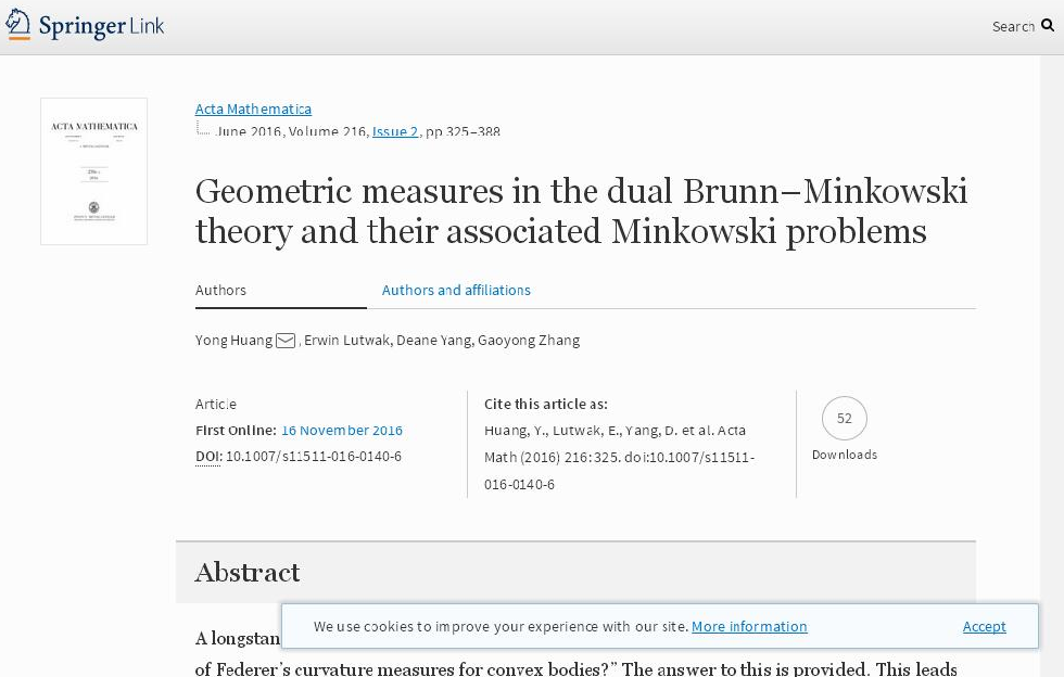 日前,国际顶尖数学期刊Acta Mathematica刊登了我校数学研究所黄勇教授与纽约大学E.Lutwak, D. Yang, 以及Gaoyong Zhang合作的论文“Geometric measures in the dual Brunn-Minkowski theory and their associated Minkowski problems”。