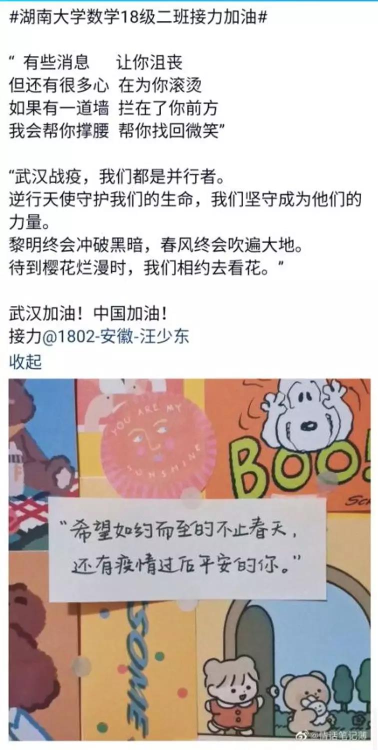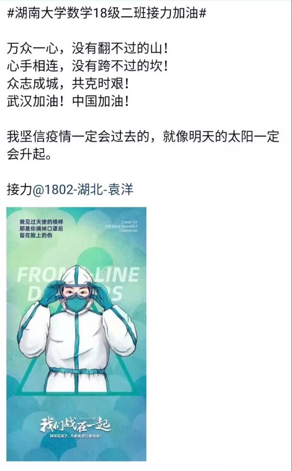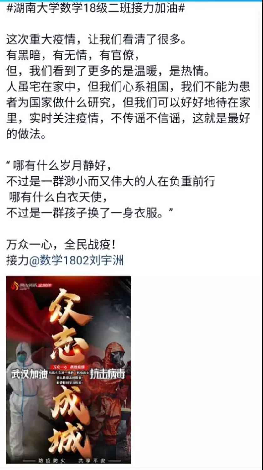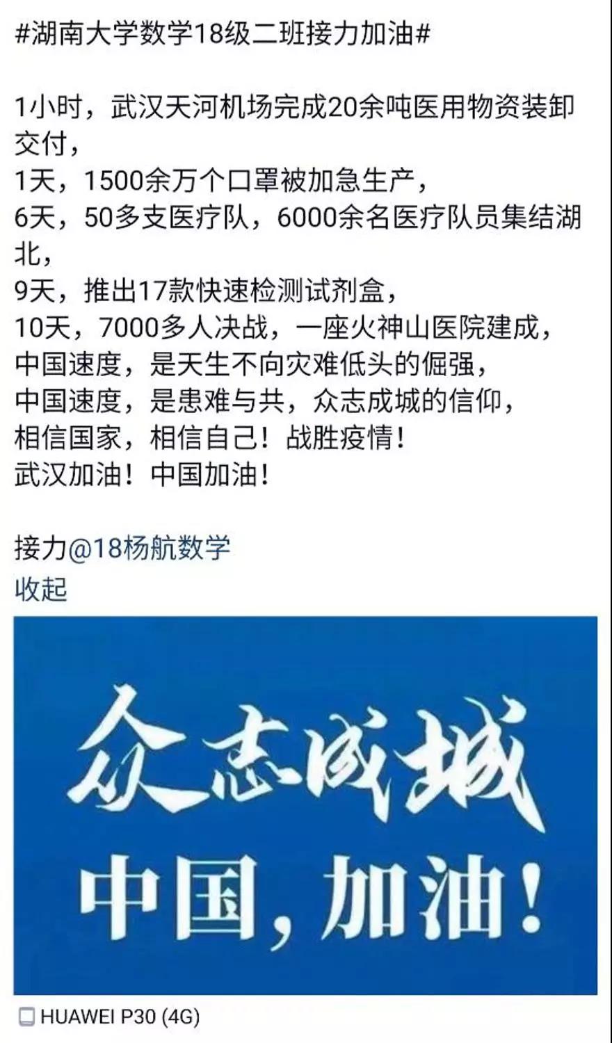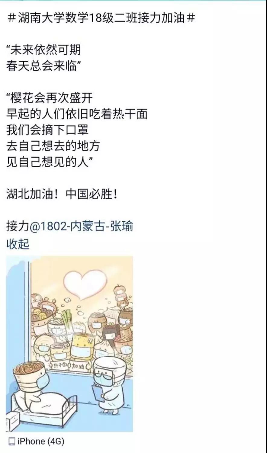 近日,黄瓜视频 数学院1802班的同学们自发组织了一场线上“接力加油“活动,为中国祈福,为武汉加油!