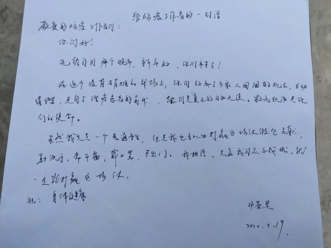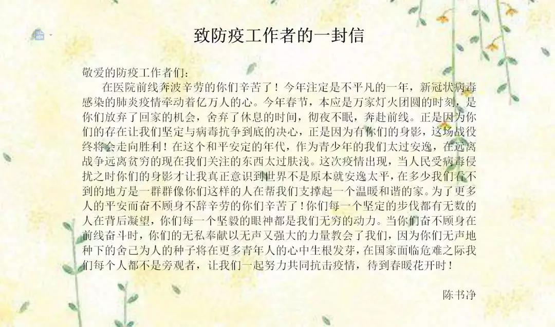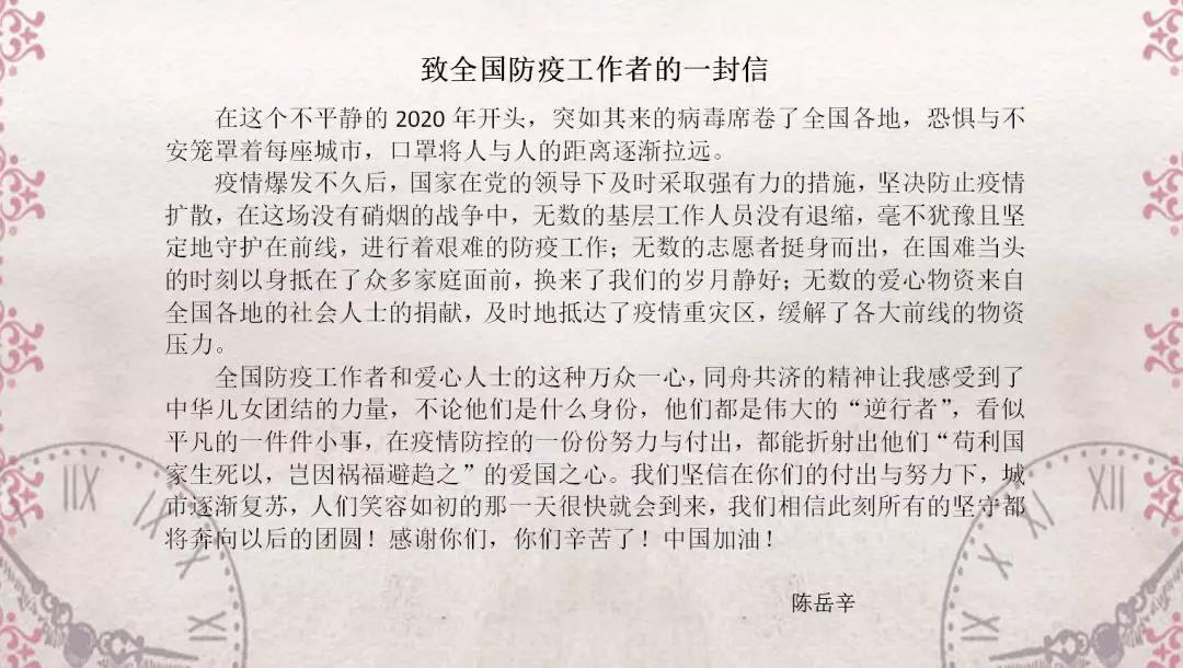 由于各地疫情情况不同,党员们因地制宜采取各有特色的方式抗疫、防疫。亲手书写感谢信给医护工作者、社区服务人员、学校值班教师等等,线上发微博、朋友圈表达对前线奋斗的英雄们的感谢和敬佩。封城和闭式管理虽然限制了我们出行的脚步,但是我们的心相连,必将我们的心意传达。以下是陈书净、陈岳辛、邓崇昊、李钰涵、刘健吾、秦睿、于晓戈、张迪、招雅萌等同志(排名不分先后)的致谢信: